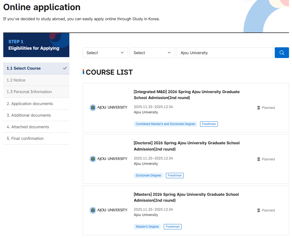 3. Search 'Ajou University' and Click the program(Master's/Doctoral/Integrated) you wish to apply for.