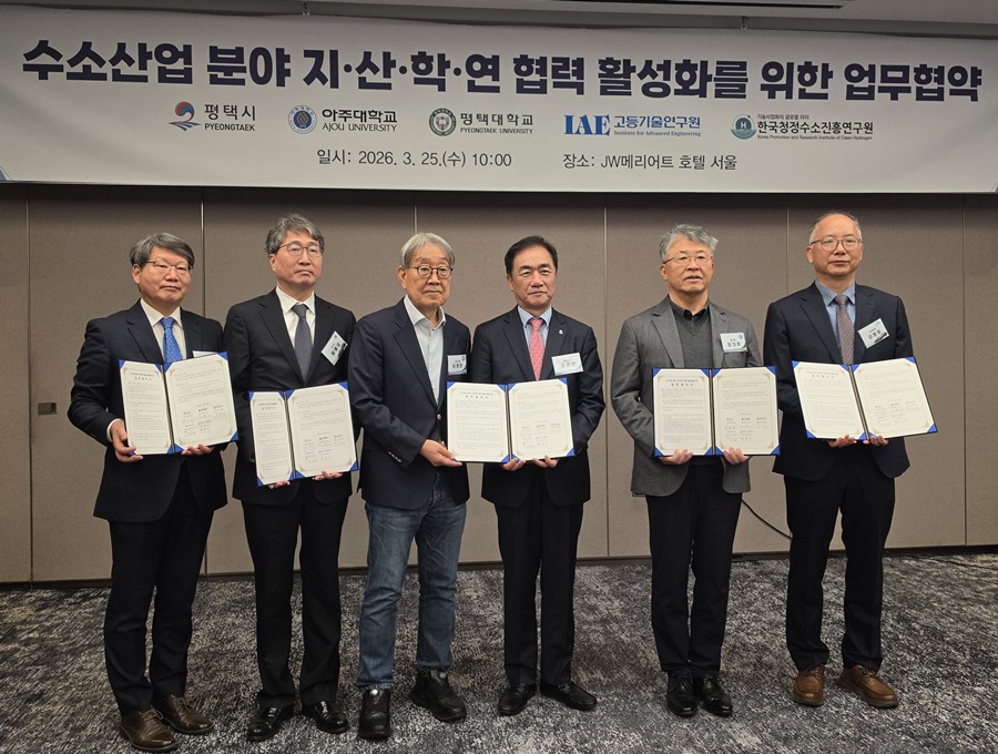 아주대학교가 지자체, 대학, 연구소와 손을 잡고 수소 산업 발전을 위한 본격적인 협력에 나섰다. 아주대학교는 지난 25일 서울에서 평택시, 한국청정수소진흥연구원, 고등기술연구원, 평택대학교와 함께 ‘수소 산업 분야 지·산·학·연 협력 활성화를 위한 업무협약’을 체결했다. 이날 협약식에는 최기주 아주대 총장을 비롯해 정장선 평택시장, 김진균 고등기술연구원장, 황용우 한국청정수소진흥연구원 이사장, 이계안 학교법인 피어선기념학원 이사장이 참석했다.